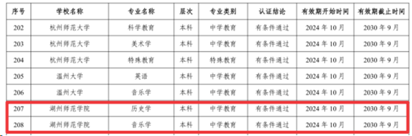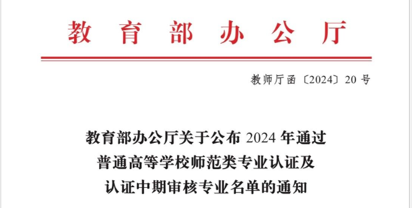 近日,教育部办公厅发布《关于公布2024年通过普通高等学校师范类专业认证及认证中期审核专业名单的通知》(教师厅函〔2024〕20号),我校历史学、音乐学2个师范专业通过中学教育第二级认证,认证有效期六年(2024年10月-2030年9月)。汉语言文学、思想政治教育、物理学专业通过中期审核。